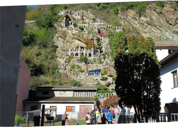 In Grosio (Tirano) lebt der Künstler Nicola Di Cesare mit seinen Mosaiken, die den Berg schmücken und „ein wenig“ an den Park Güell von Gaudi erinnern.